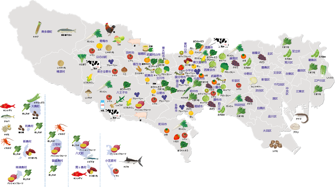 ※野菜、果樹等の表示は、各地域の特産品を示したもので、生産量が最も多い農林水産物とは限りません。提供:東京都産業労働局 農林水産部 (一部修正箇所あり)