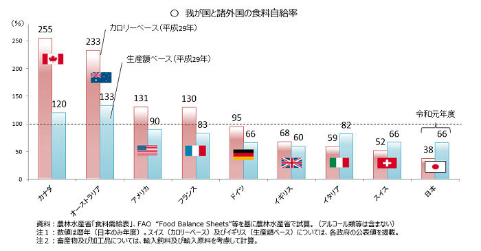 日本は先進国(カナダ、フランス、ドイツ、イタリア、日本、英国、米国の7か国)の中で自給率が最低の38%。ちなみに、カナダ255%、オーストラリア233%、アメリカ131%になります。
