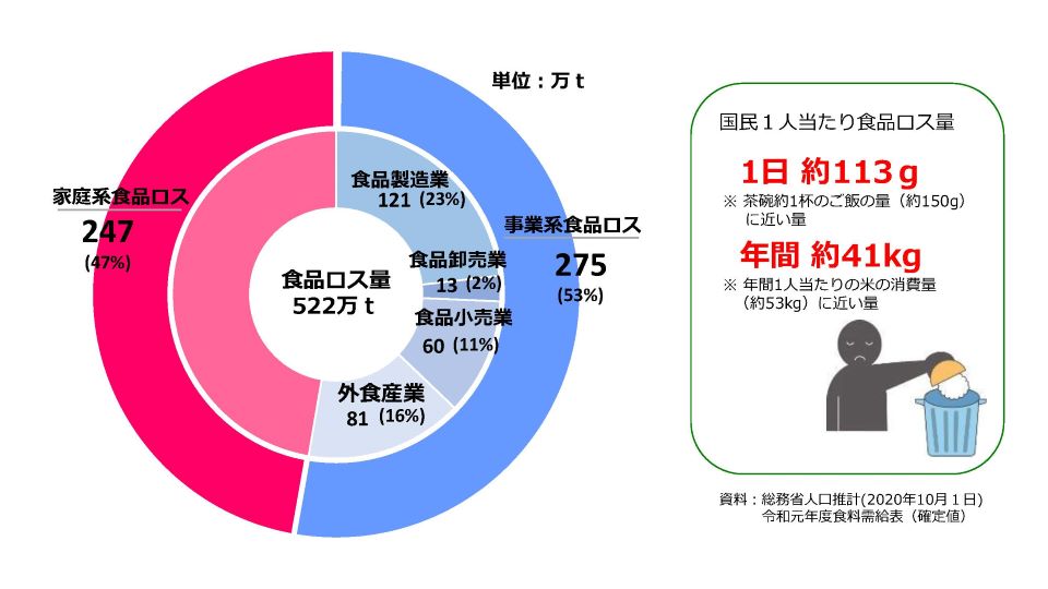 毎日1人当たりお茶わん1杯分に近い約113グラム、年間だと約41キロもの食品ロスが発生しています。(令和2年度)