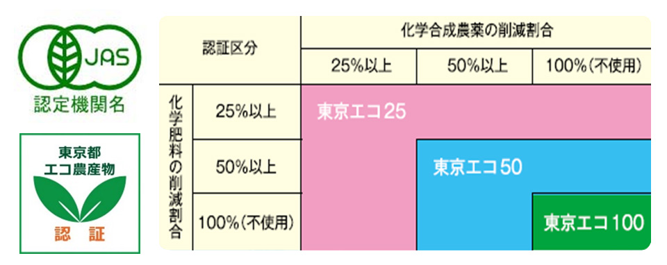 東京都でも「東京都エコ農産物認証制度」により、化学合成農薬と化学肥料を削減して栽培された農産物であることを認証する制度を実施しています。野菜や果樹等68品目を対象に、化学合成農薬と化学肥料を下の表のとおりに削減して生産した農産物を認証し、認証マークを付与することを認め、消費者が選びやすいようにしています。