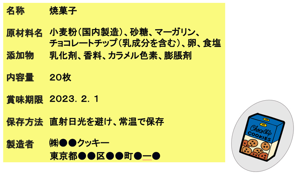 お菓子の箱に「小麦粉(国内製造)、砂糖、マーガリン、チョコレートチップ(乳成分を含む)、卵、食塩」と表示されていた場合、小麦粉が一番多く含まれているお菓子ということになります。
