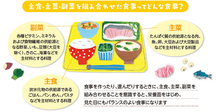 栄養バランスのとれた食生活のためには、主食・主菜・副菜を組み合わせることが大切です。さまざまな食材を選んで食事をしましょう。