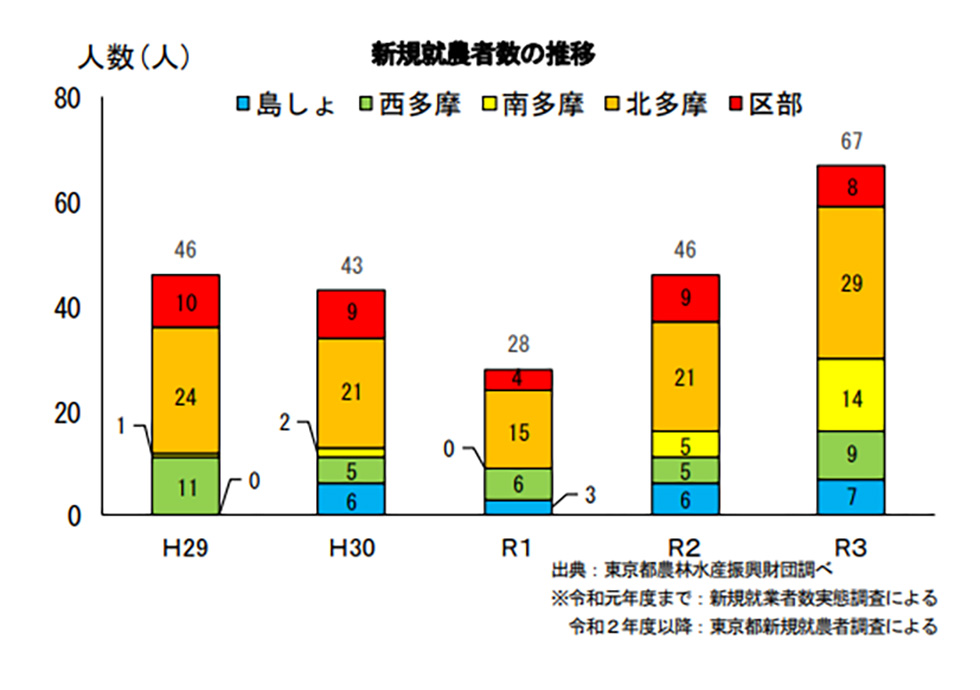 東京都では、令和3年度の新規就農者の数は67名で、令和2年に比べ21人増えています。消費地に近い「東京ならでは」の農業を目指して、都内の農地を借りて農業を始める農外からの就農希望者が増え、新たな担い手としての期待が寄せられています。