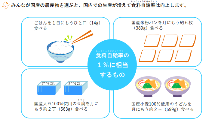 また、⽇本は⾷料や燃料、肥料などの資材を外国からの輸⼊に頼っているため、外国での異常気象や国際情勢などの影響を受けやすくなっています。これからも安定して⾷べ物を確保していくためには、国内で生産できるものはできる限り国内で生産し、国産の食べ物を積極的に食べて食料自給率の向上を図っていくことが重要です。