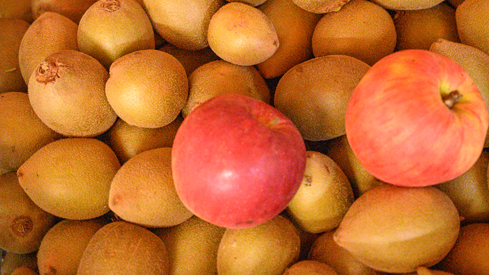 キウイは樹上では完熟しません。収穫後にリンゴやバナナのようにエチレンガスを出す果物と一緒に保管しておくことで、柔らかくなり、甘みが出ます。