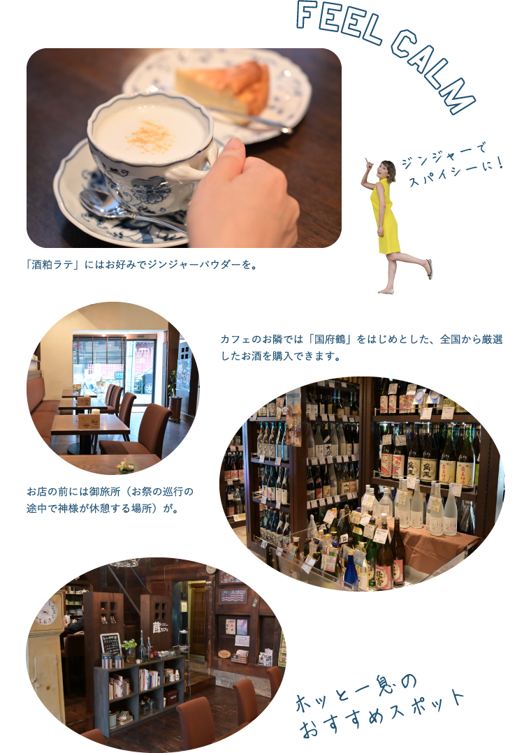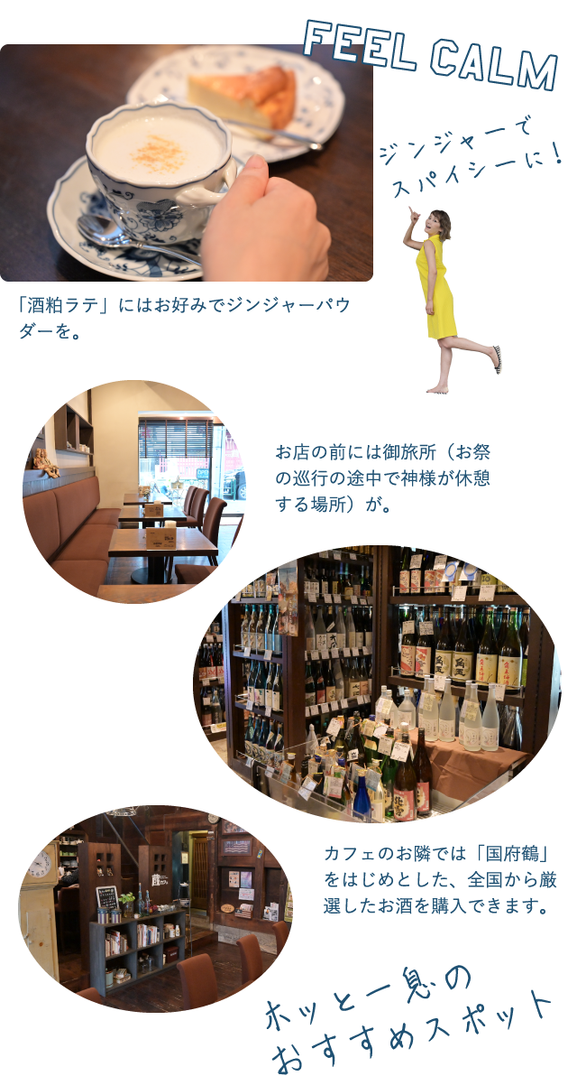 創業1860(安政6)年の老舗酒屋「野口酒造」の酒蔵を改装した喫茶店が、5年前にリニューアルオープン!大きな梁と太い柱でゆったりと落ち着いた店内は、レトロな雰囲気とともに歴史を伝えれくれる。野口酒造の地酒「国府鶴」の酒粕を使った「酒粕ラテ」は、酒粕にミルクとハチミツを加えて作ったオリジナルメニュー。酒粕の芳醇な香りと柔らかなミルクの口当たりが、ほっと心をほぐしてくれる一品。オススメのチーズケーキとの相性も抜群です!