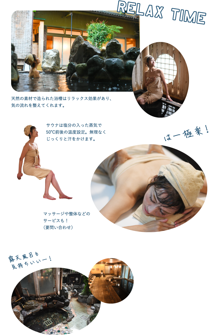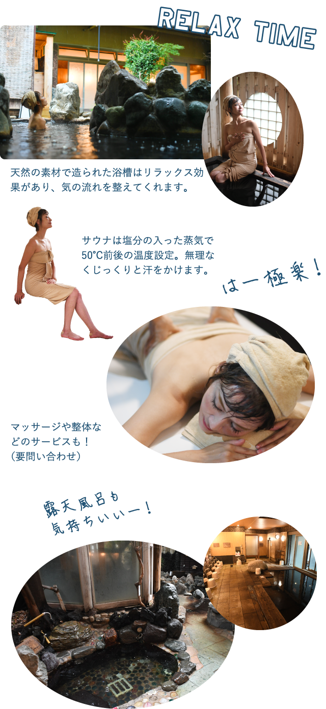 濃い黒湯の天然温泉と非日常を感じられる空間で心も身体もリラックス