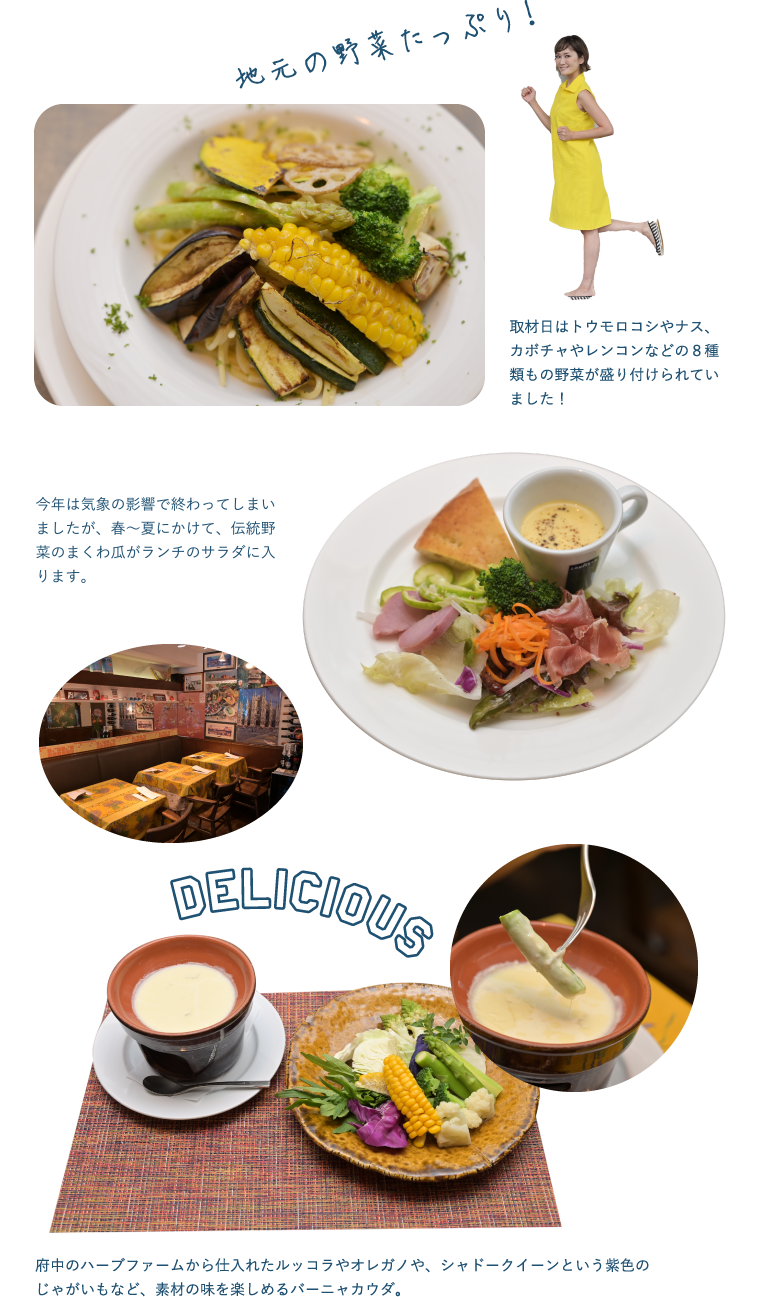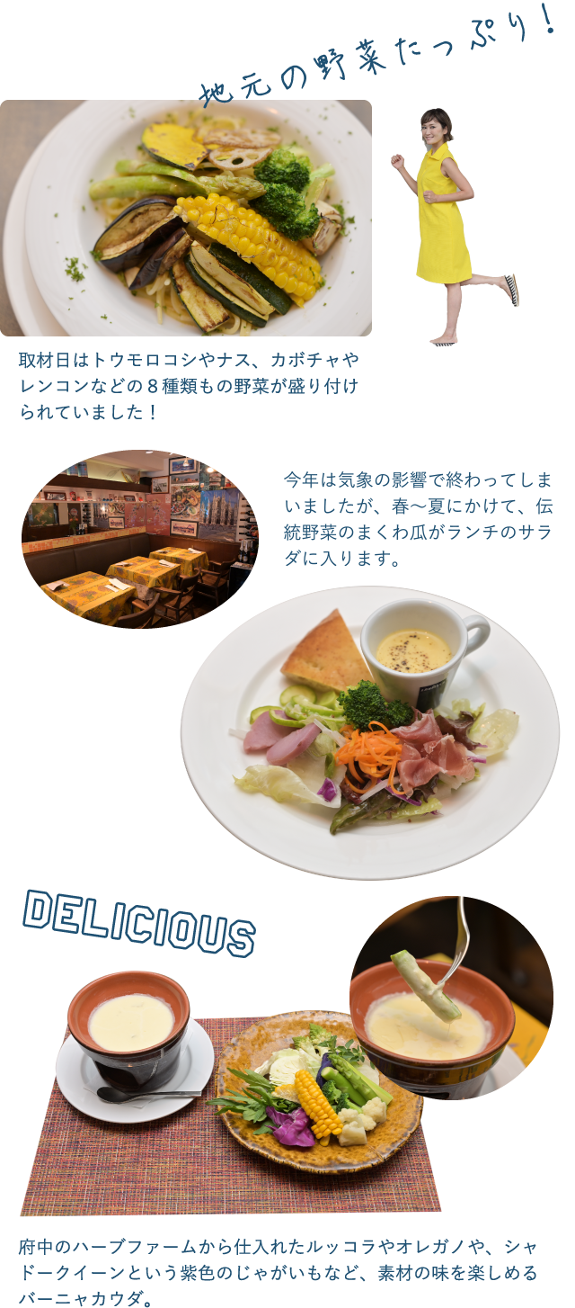 府中産の野菜や卵などを味わえる暖かな雰囲気の街のイタリアン。畑の草むしりを手伝ったり、お店で出たコーヒーのカスを肥料として農家さんへ持っていくなど、親しい付き合いの中で、旬の素材を仕入れているので鮮度も旨味も抜群!名物の「焼き野菜のパスタ」や、「地元野菜のバーニャカウダ」は何種類もの野菜が盛り付けられ、彩りが華やかで満足感のある一品。季節や日によって野菜の種類が変わるので、何度食べても楽しめます。