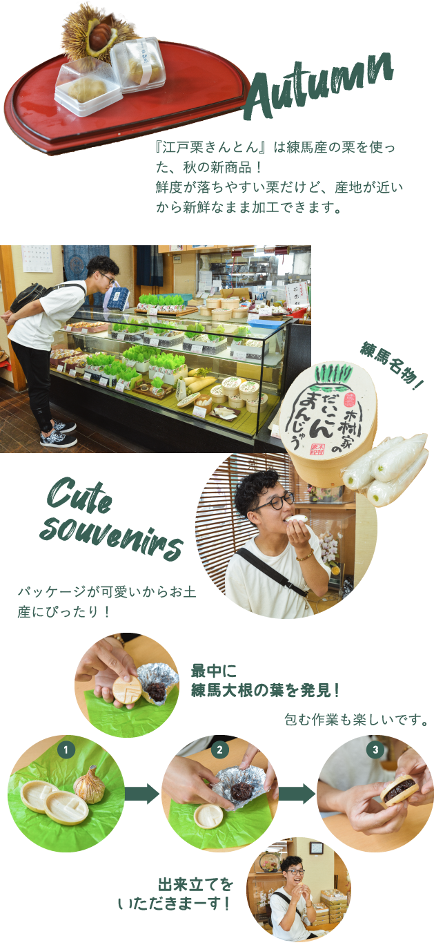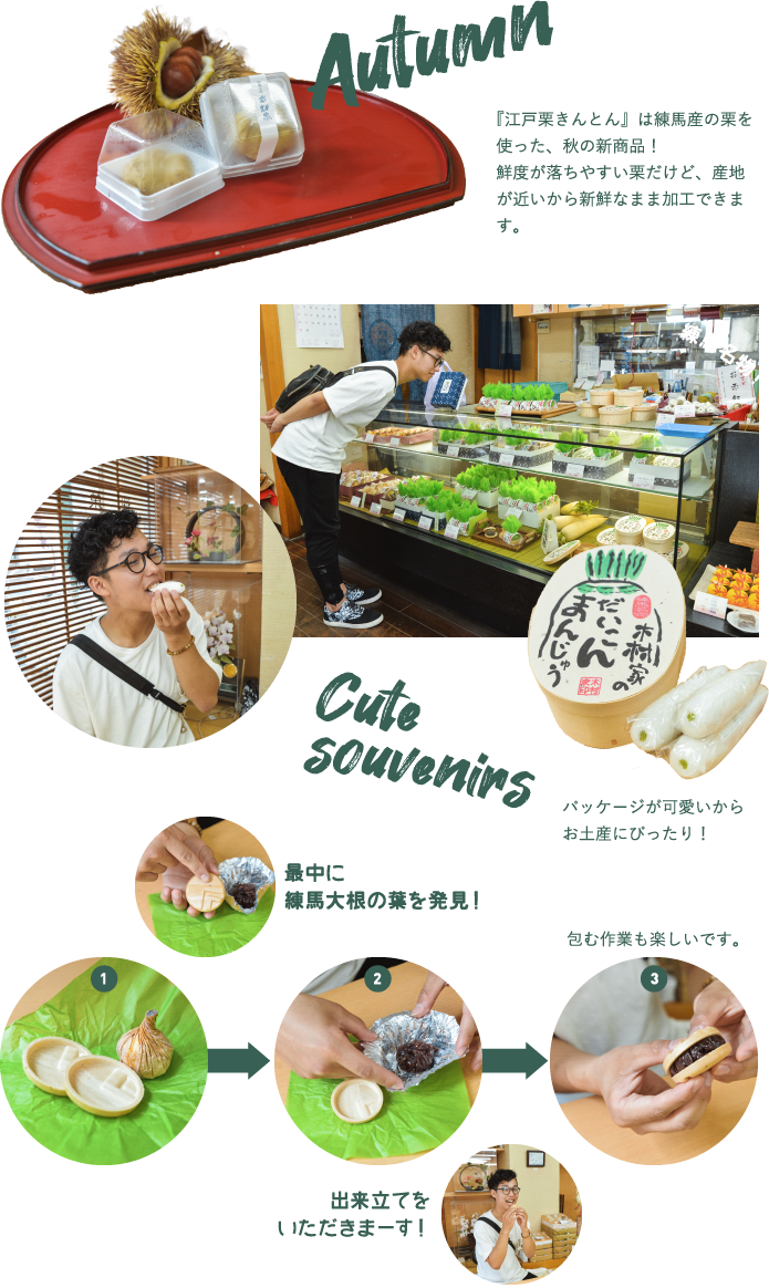 練馬の代表的な野菜『練馬大根』が可愛らしい和菓子に大変身!おまんじゅうの白い皮にはすりおろした練馬大根が、緑の部分には練馬大根の葉が使われていて、練馬大根を見事に再現。もちもちとした皮となめらかで甘さ控えめなこし餡が、上品な美味しさ。たくあんクッキーを添えてわっぱ型のお弁当箱に入れた、遊び心をくすぐる一品です。また、練馬大根の葉を入れた香ばしい最中は、自分で餡を包むので食感も香りも作りたての味!パリパリっと香ばしい小麦の香りを楽しめる最中と、ゴロゴロと粒が大きく、ふっくらと炊き上げられた餡のコントラストが絶品です。