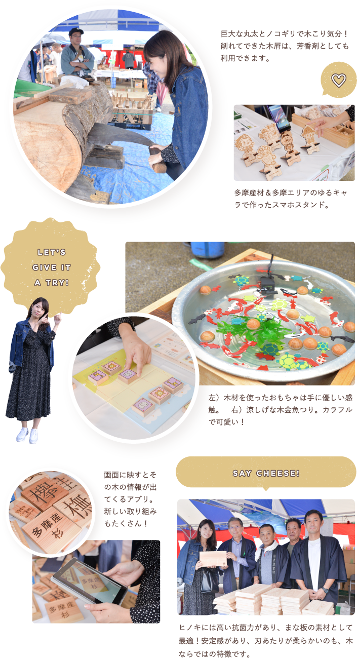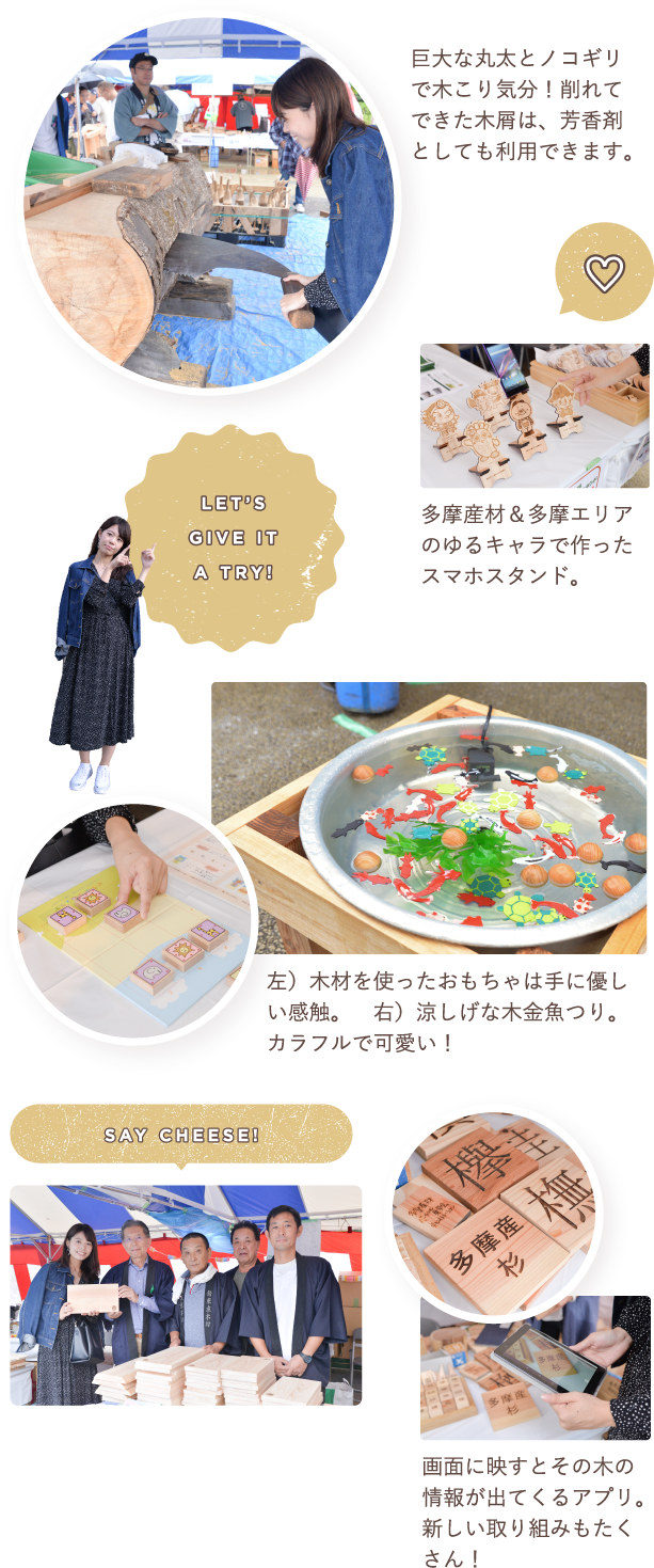東京の木・多摩産材に加え、日本各地の木材にふれあえる、毎年木場公園で行われる恒例のイベント。今回も木工作で実用的な椅子やお箸を作ったり、木挽き(こびき)と呼ばれる伝統的な製材技法を体験したりと、木のぬくもり・やわらかさ・爽やかで優しい香りを感じられる体験イベントが盛りだくさん!木製品の展示販売や木金魚すくいなどの木を使ったおもちゃやゲーム、寸劇「森の学校」、ブルーベリーやオリーブの苗木配布など、大人も子どもも楽しめる様々なブースが出展しました。木場が「木材のまち」だったと知らない新しい世代・住民にも、木の良さ、森を育てる大切さを伝えていける、長年にわたって親しまれるイベントです。