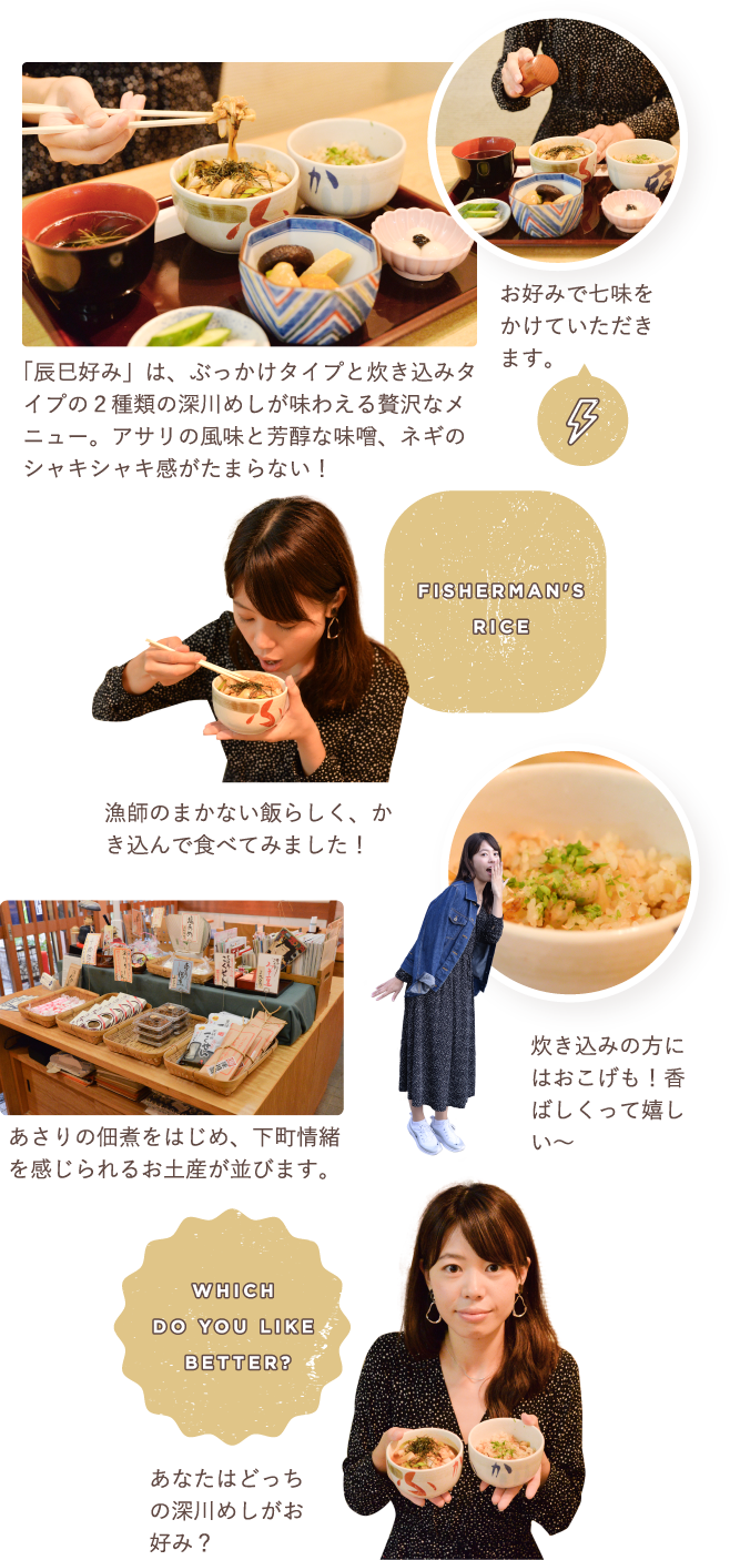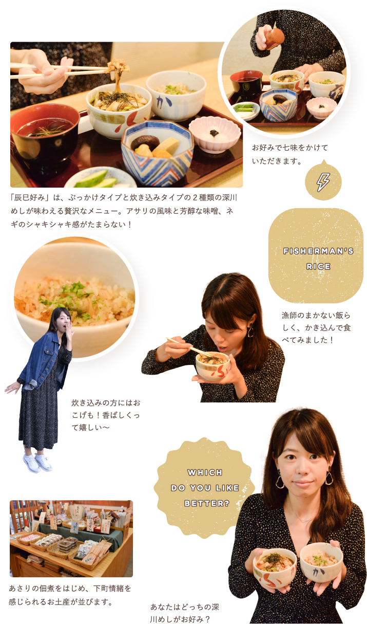 江戸時代の深川は漁師町。遠浅の海が続き、貝類が豊富に獲れました。その漁師たちがご飯の上にアサリの味噌汁をぶっかけて食べたのが、現在の深川めしのルーツ。その後、大工などの職人がお弁当に持っていけるようにと、アサリを入れた炊き込みご飯型の深川めしが広く普及しました。しかし、東京湾の埋立などで深川から漁師がいなくなり、深川めしは衰退してしまったのです。深川宿では、その伝統的な味を地元の漁師さんから学び、当時の味を再現!一度は消えてしまった深川めしの味を現在に伝えています。とても貴重な東京産の新鮮な生アサリを使っているのは、こだわりと情熱の証!「ぶっかけ」と「炊き込み」の2種類を楽しめる、深川の伝統を味わえるお店です。
