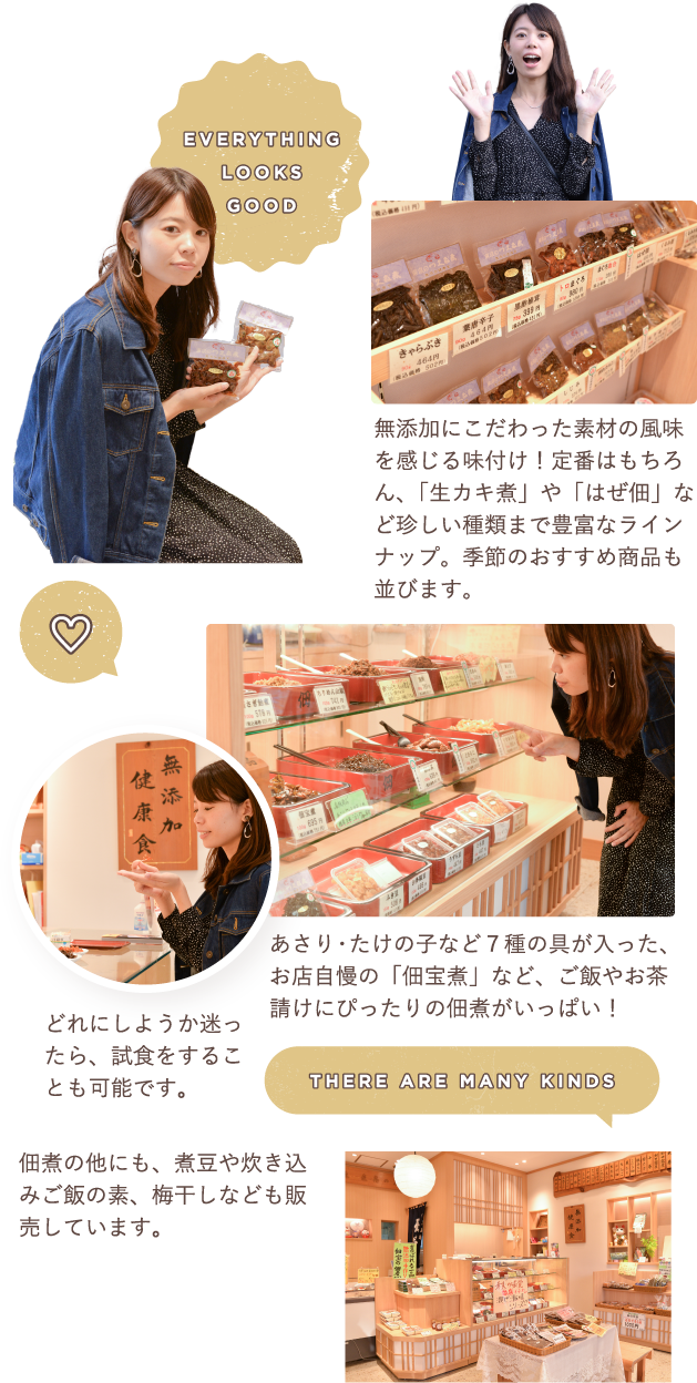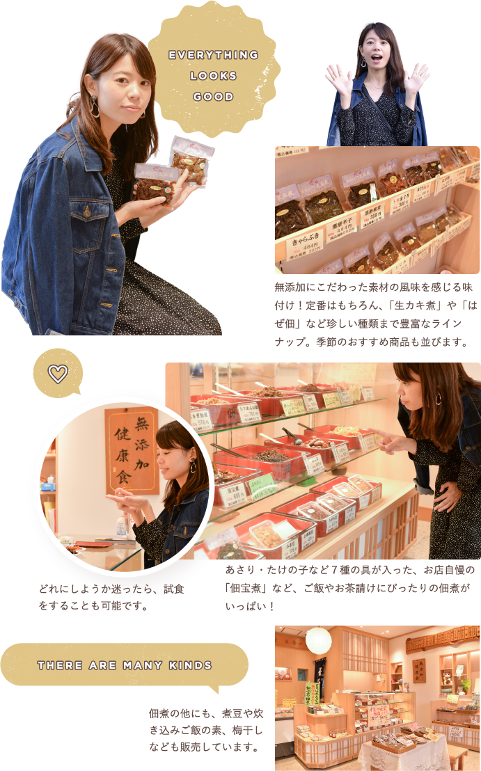 一つ一つの素材に合わせて味付けを調整して作る伝統の佃煮は、素材の風味が活きたこだわりの品々。創業当時の製法を守り継ぎ、添加物を一切使用せず、手作りの身体に優しい佃煮を追求しています。また、佃煮では初めて、東京都地域特産品認証食品(商品に込めた思いやこだわり、味や品質等を都が認証した食品)に認められ、東京を代表するお土産としても知られています。一番人気の定番「生あみ」や「田作り」「赤えび」「三色こぶ」など種類も豊富。旬の新商品や豊洲市場から届く野菜も店頭販売しており、近隣住民からも人気のお店です。