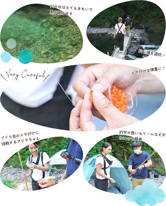 まず、区画分けされた中で好きな釣り場を選びます。場所選びは、[※1]BBQ施設が近い場所、日陰が多い場所、川の流れが早い・緩やかな場所など、自分の遊び方に合った場所を選ぶのがオススメです。アリサちゃんは[※2]エサ釣りエリアのBBQ施設が近く、日陰の多い場所を選びました。