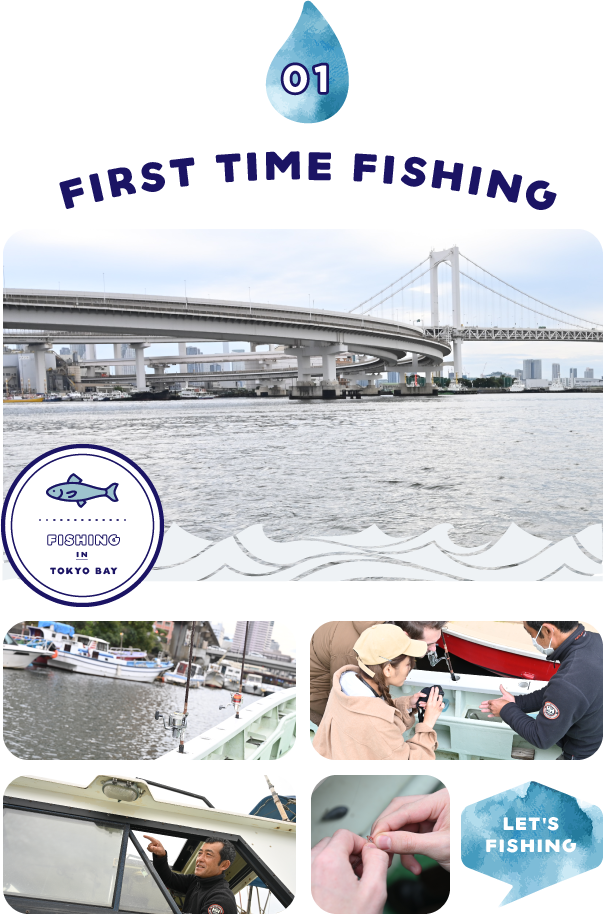 今日は釣り初体験!しかも日本でとなると気持ちも高まります。旅の始まりは東京のレインボーブリッジ近くにある小さなボート乗り場から。ライフジャケットを着て、いざ出発!