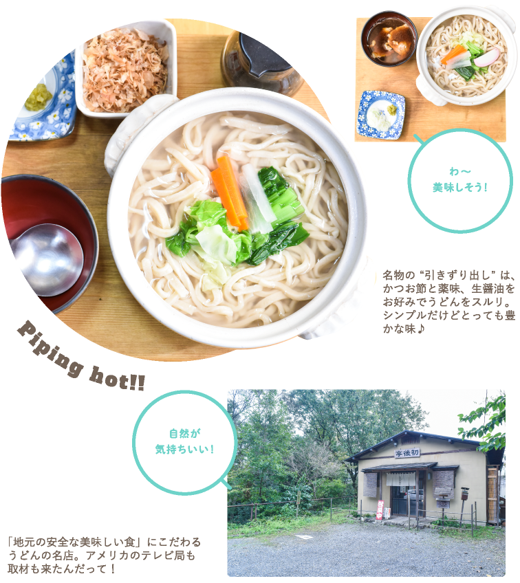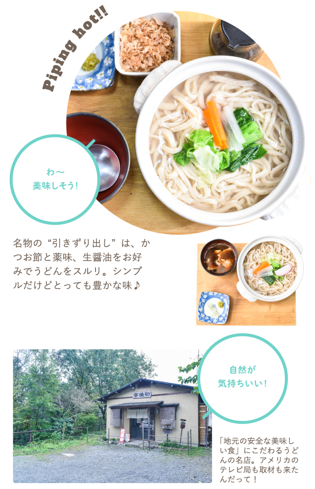 深い山々に抱かれたあきる野市。美しい景色が広がるこの町に、こだわりのうどん屋さん「初後亭(しょうごてい)」はあります。地元の人に愛され30年の名店で、使う小麦粉は100%自家栽培。その小麦粉とあきる野市に伝わる製法でつくられるうどんは、口に入れた瞬間に地粉の香りがふんわり。現代のうどんとはひと味もふた味も違う味わいで、やさしくて、懐かしくて、美味しい♪ “ここにしかない豊かな味”を心いくまでぜひご賞味あれ。食べ方は、あきる野市伝統の “引きずり出し”で!