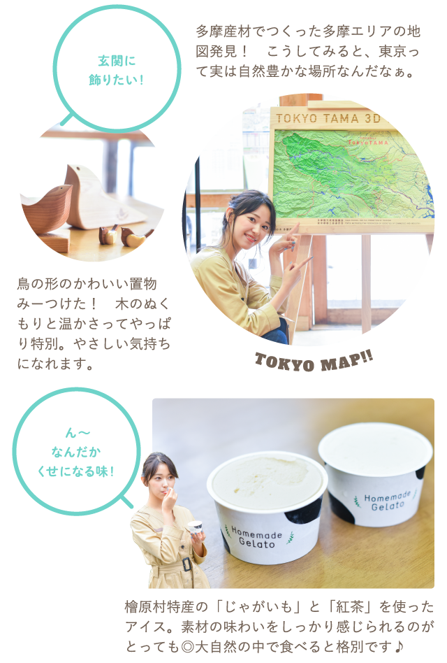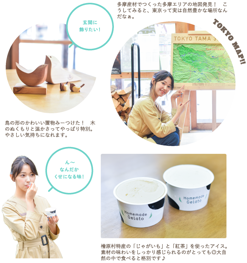 木のぬくもり、地元の方々のあたたかさにも感動しました多摩産材が素敵なものづくりに活用されているのを、肌で感じられてよかったです! 次は友だちとクラフトづくりにも挑戦してみたいな。あと、こんな大自然が東京にあるなんて驚きです。でも、素晴らしいですよね。東京にも、自然の生活があって、人々の交流があって・・・。今回の旅でそういう一面も見ることができて、より東京を好きになれました♪ さらに、檜原村観光協会さんの「じゃがいもアイス」! すっごい美味しくて、一口でハマっちゃいました(笑)。