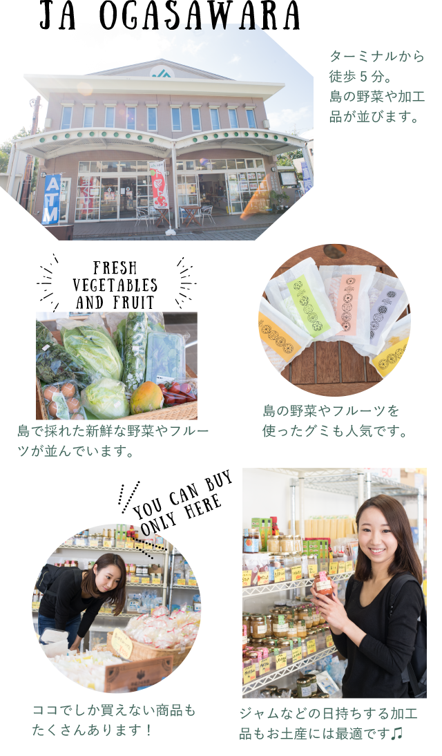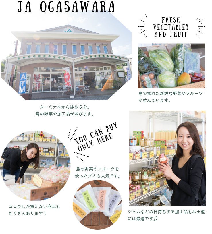 小笠原の野菜と、小笠原で採れた農作物を使った商品が揃う「JA小笠原農産物観光直売所」。小笠原の「おいしいもの」を探すなら絶対外せません。会社や学校に持っていくお土産には、小分け包装されているので配りやすいレモンゼリーや、小笠原フルーツを使ったグミがおすすめ。日持ちのする小笠原の塩や、島唐辛子が入ったラー油、小笠原の新感覚調味料オガスコもあります。運が良ければ、希少価値の高いハチミツや母島産のコーヒー豆が買えるかもしれません。