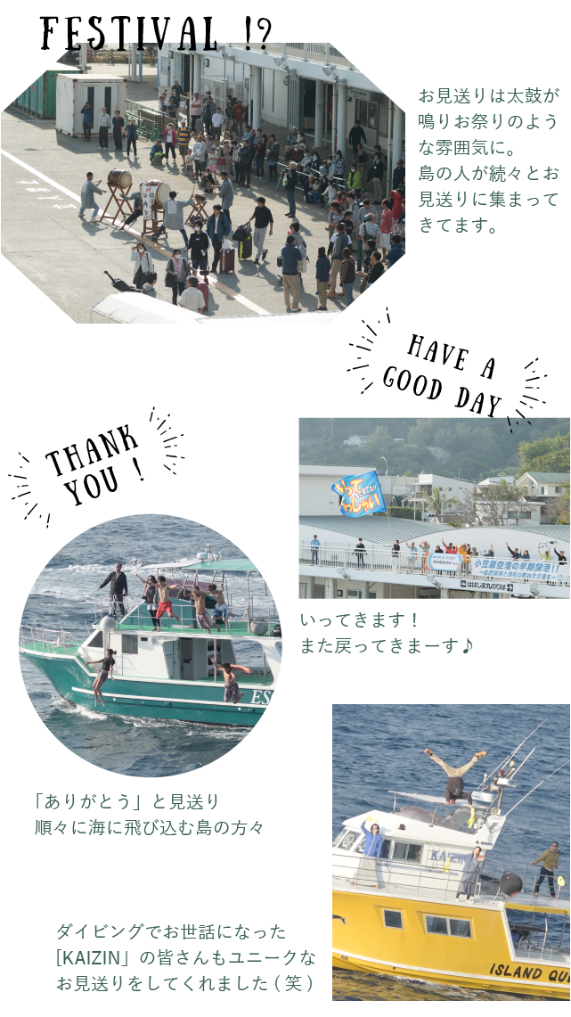 小笠原では、また戻ってきて欲しいという気持ちを込めて、「いってらっしゃい!」と見送ります。